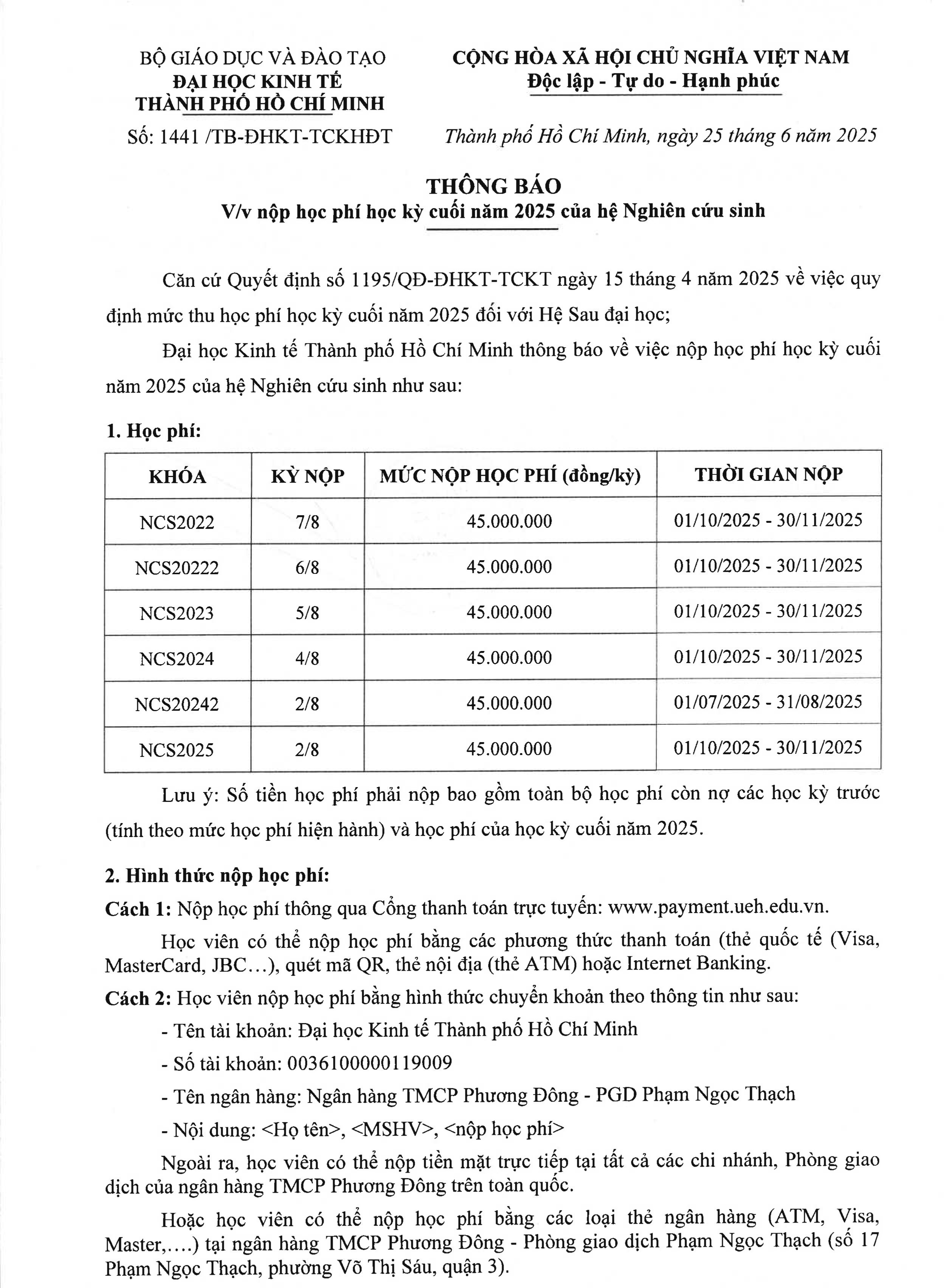 THÔNG BÁO V/v nộp học phí học kỳ cuối năm 2025 của hệ Nghiên cứu sinh