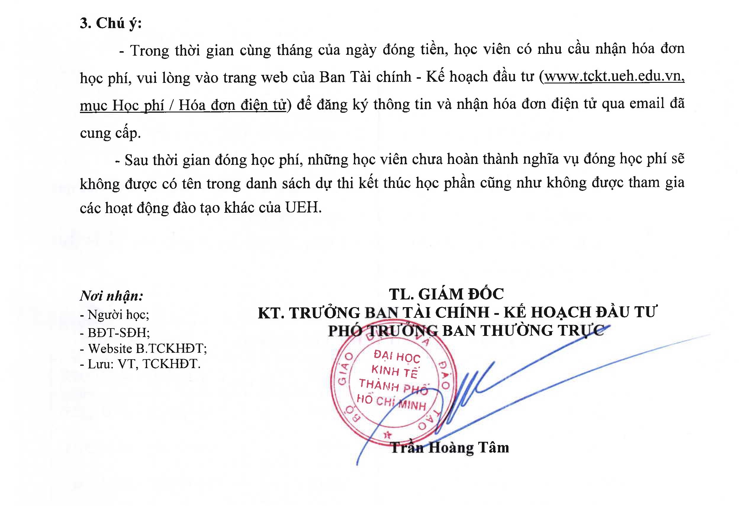 Thông báo về việc nộp học phí của học viên cao học và bồi dưỡng khóa 23