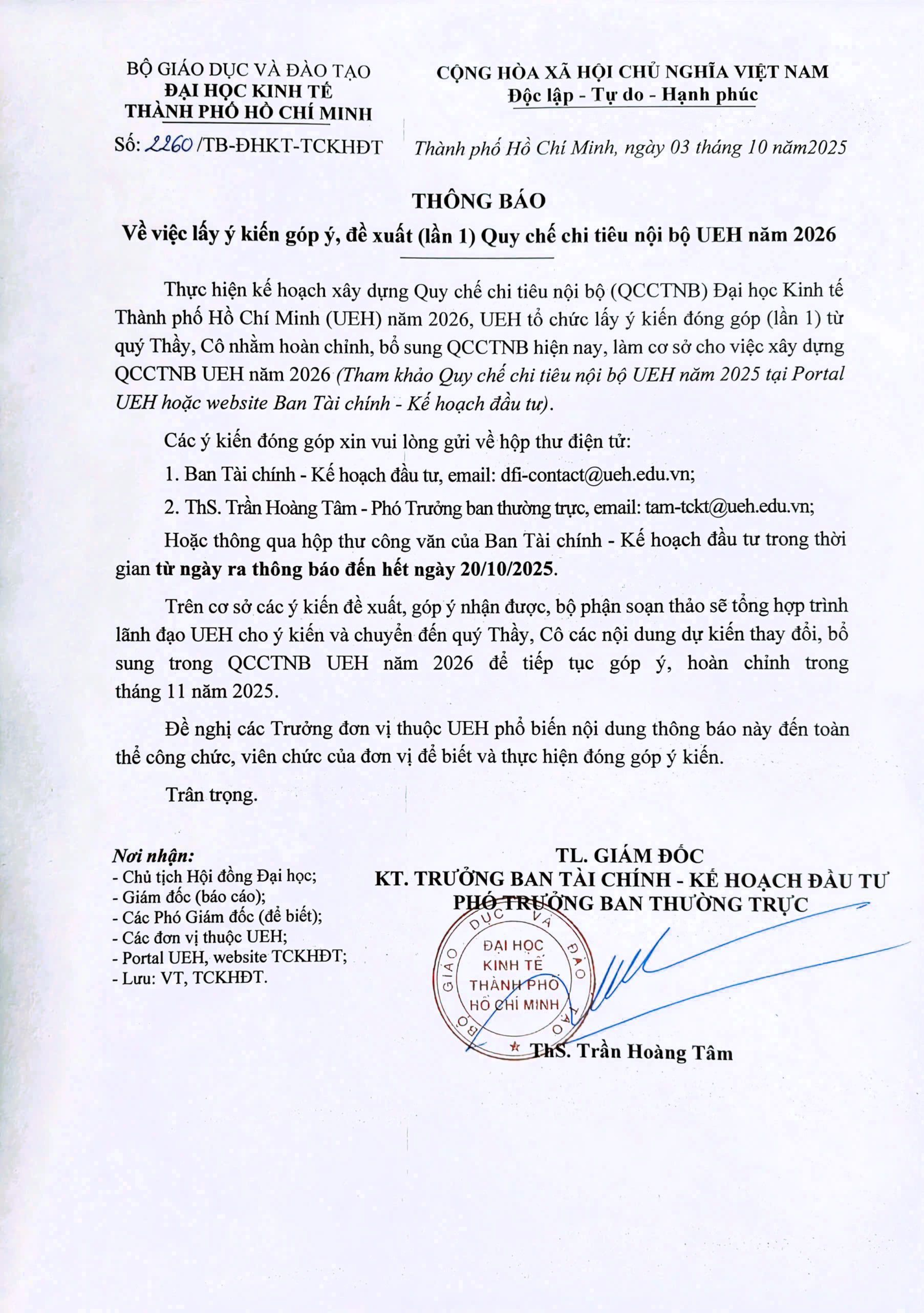 Thông báo về việc lấy ý kiến góp ý, đề xuất (lần 1) Quy chế chi tiêu nội bộ UEH năm 2026