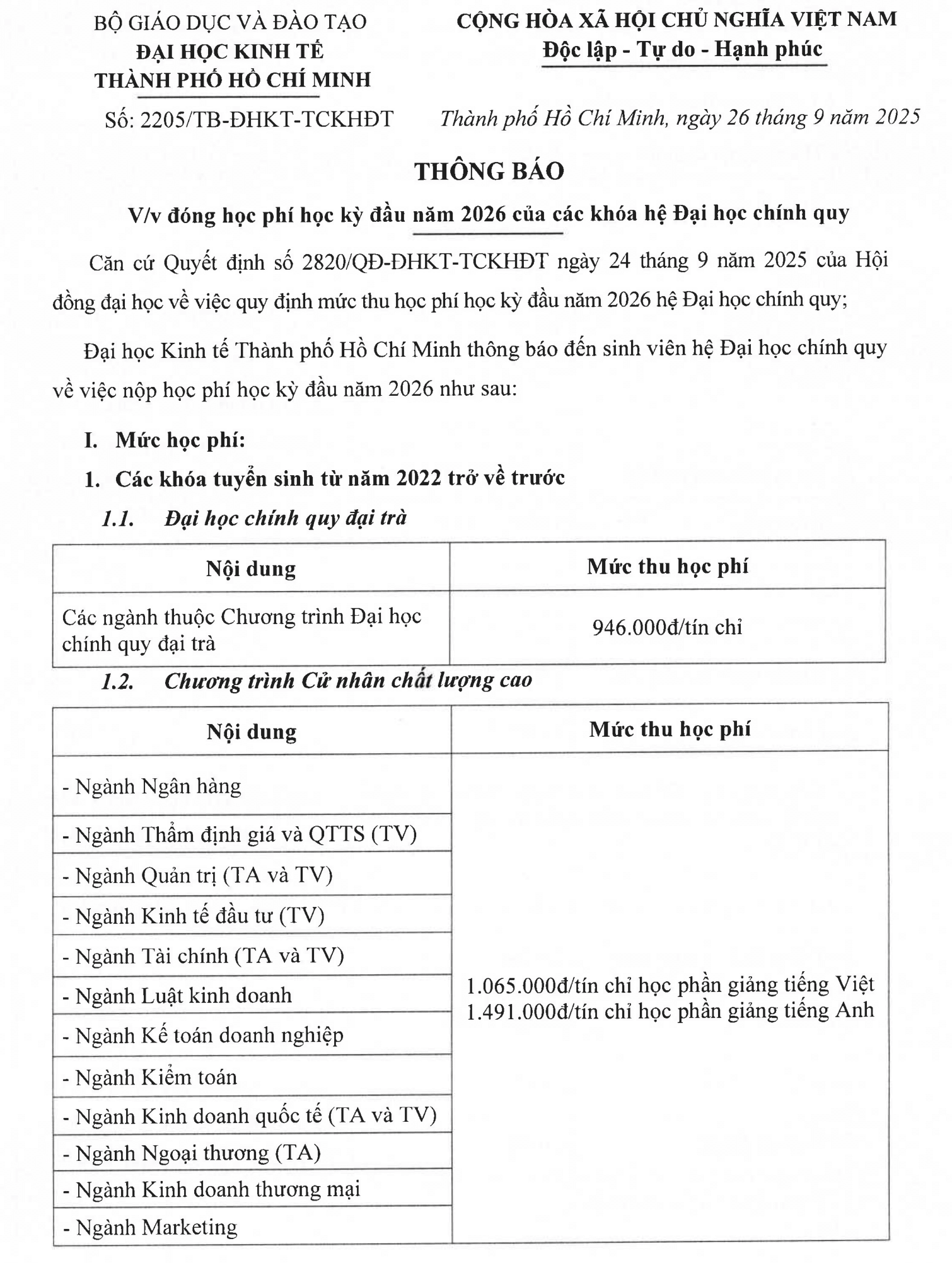 THÔNG BÁO V/v đóng học phí học kỳ đầu năm 2026 của các khóa hệ Đại học chính quy