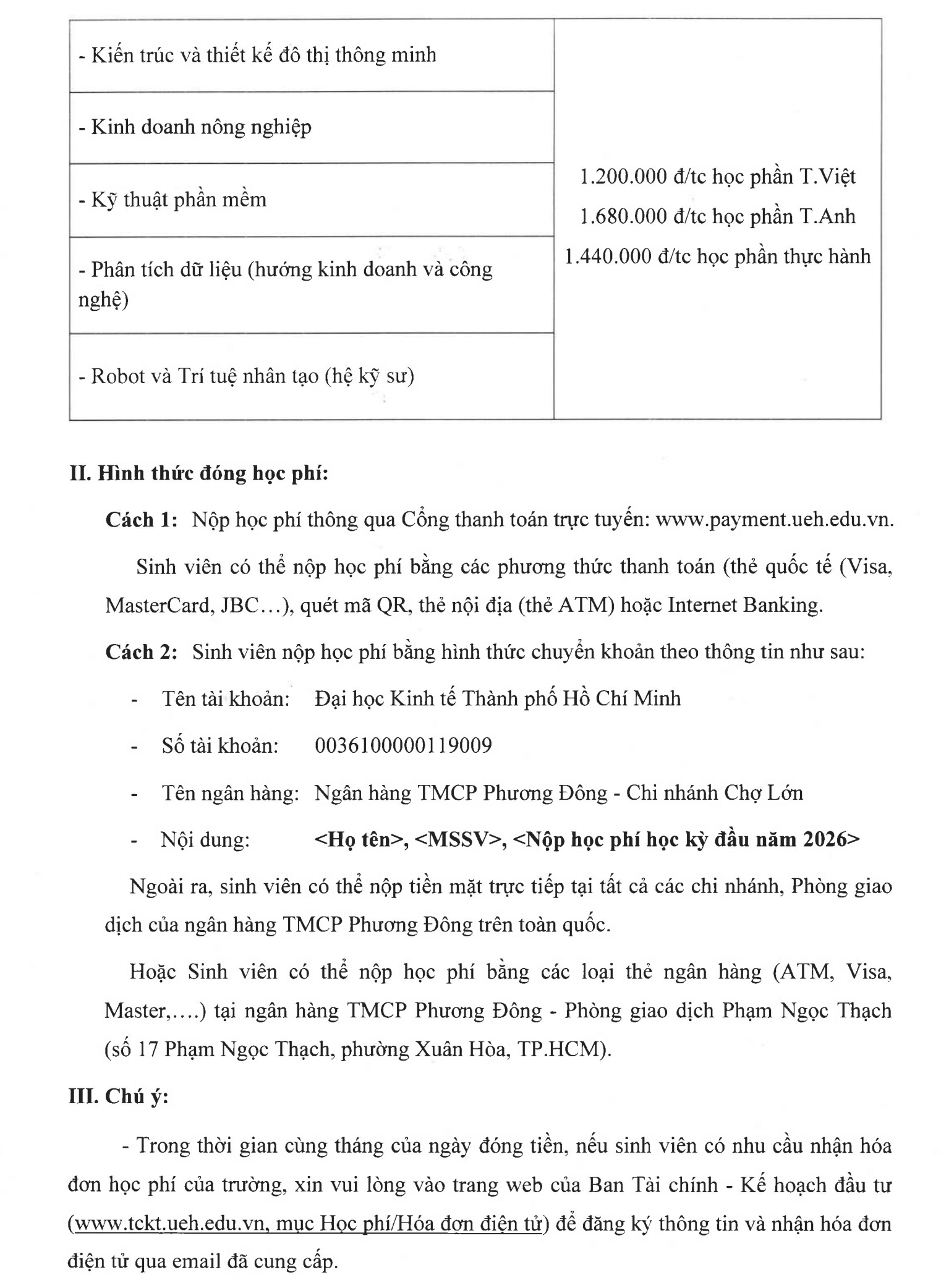 THÔNG BÁO V/v đóng học phí học kỳ đầu năm 2026 của các khóa hệ Liên thông Đại học chính quy, Văn bằng 2 Đại học chính quy