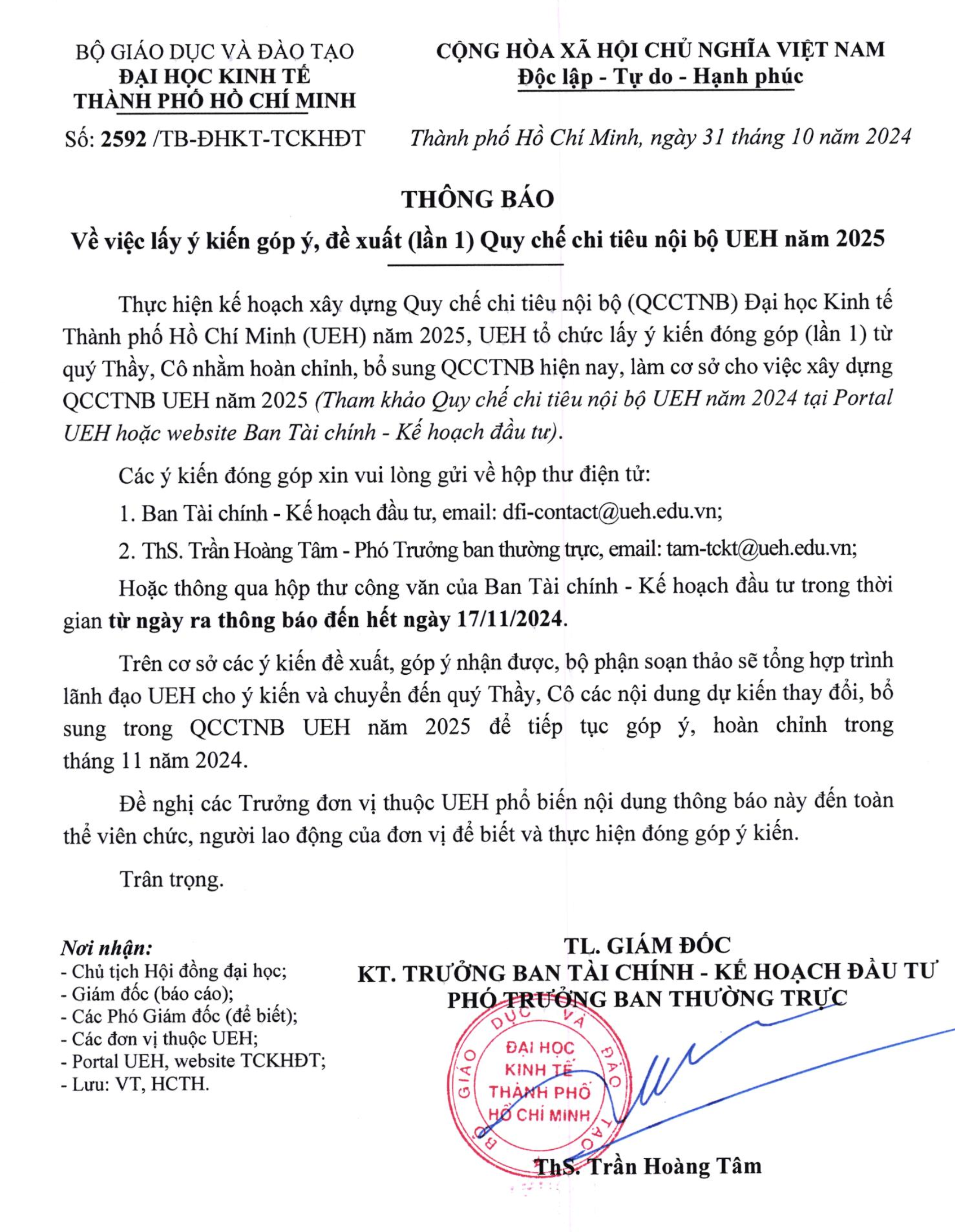 Thông báo về việc lấy ý kiến góp ý, đề xuất (lần 1) Quy chế chi tiêu nội bộ UEH năm 2025