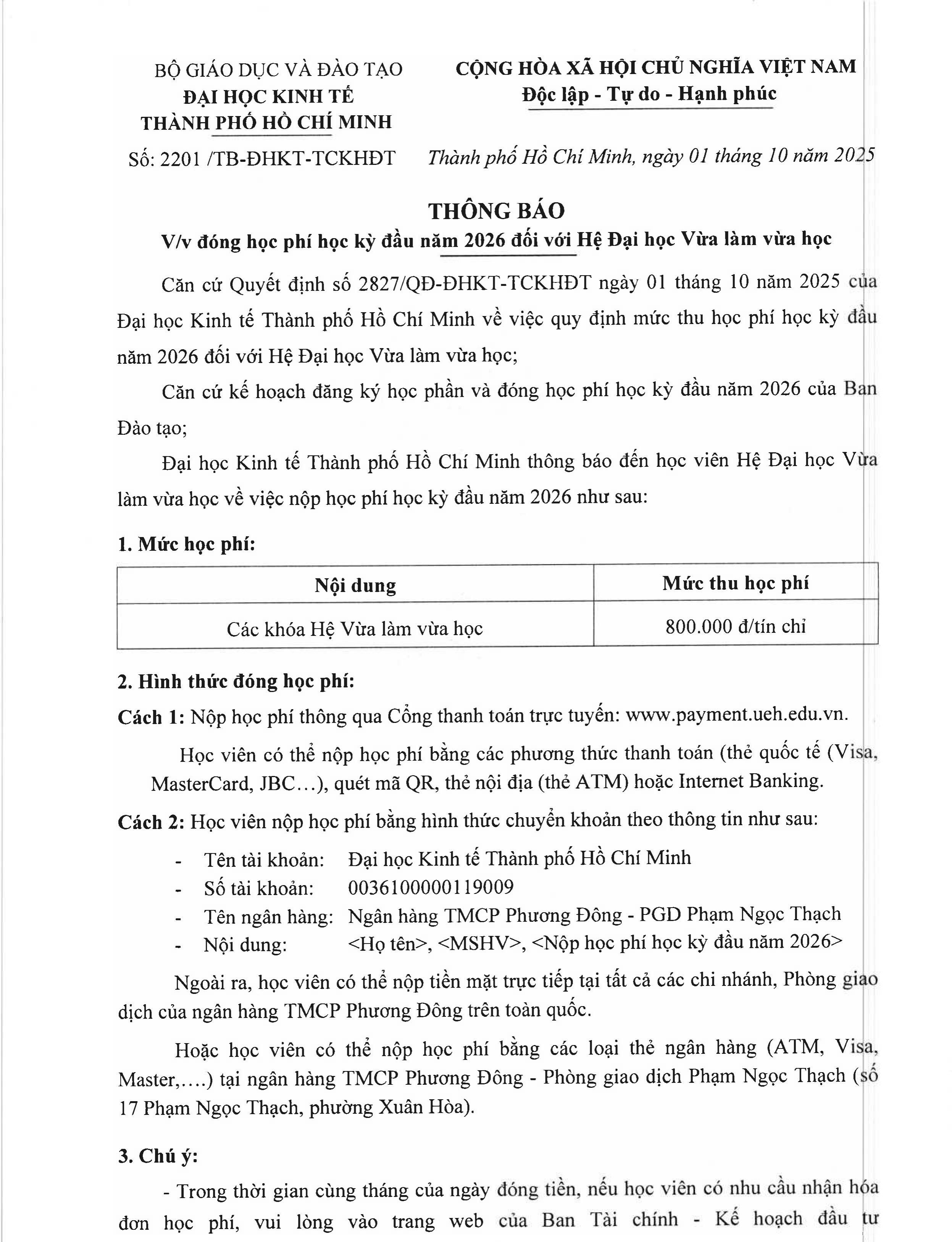 THÔNG BÁO V/v đóng học phí học kỳ đầu năm 2026 của các khóa hệ Liên thông Đại học chính quy, Văn bằng 2 Đại học chính quy
